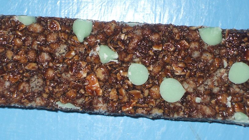 Batoniki muesli z masłem orzechowym i kawałkami czekolady w polewie z mlecznej czekolady (miękkie)