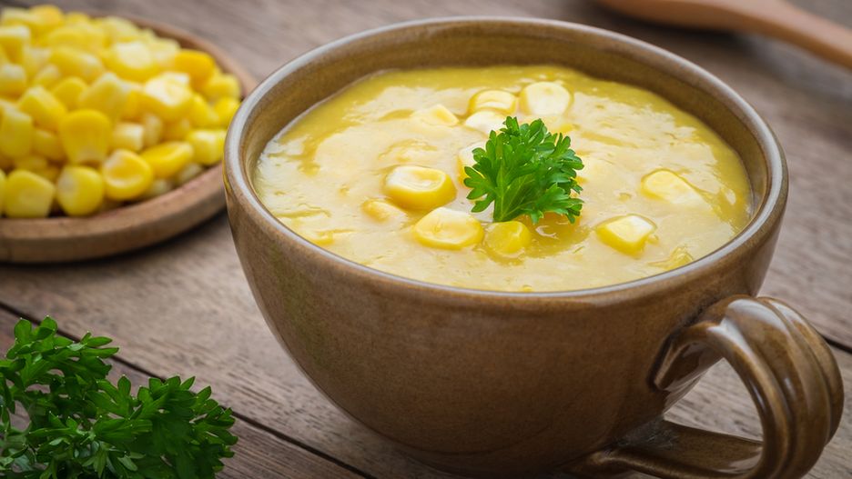 Śniadanie: zupa kukurydziana z makaronem i włoszczyzną.