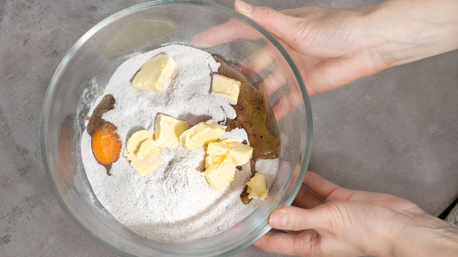 Ubite na sztywną pianę białka wymieszaj z przesianą mąką krupczatką oraz masą, która powstała po utarciu masła klarowanego z żółtkami.