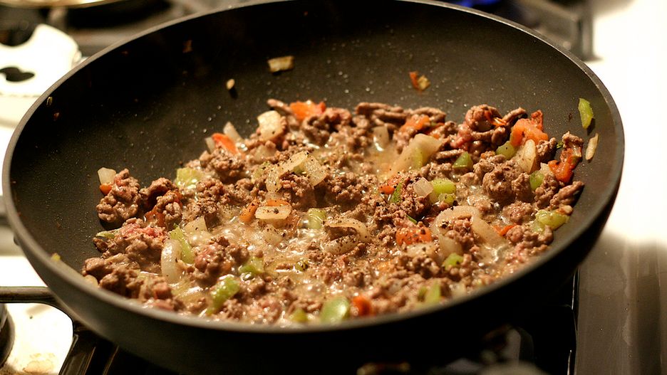 Mięso grubo mielone z wołowiny (95% mięsa, 5% tłuszczu) zrumienione na patelni