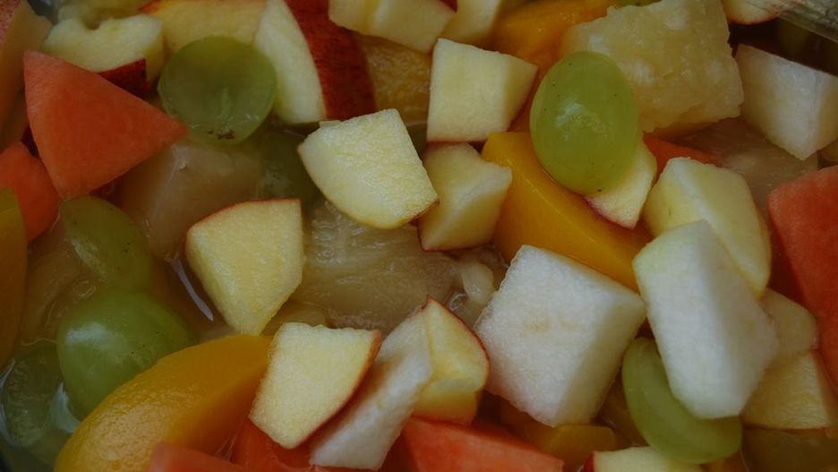 Mieszanka owoców (brzoskwinie, gruszki, winogrona) w puszce w lekkim syropie (owoce i płyn) – ile ma kalorii i składników odżywczych?