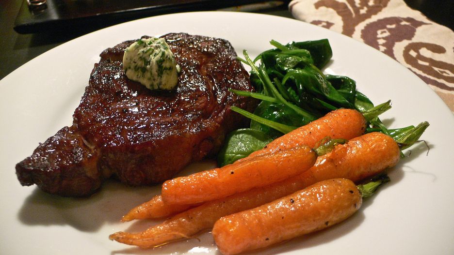Pieczony stek z antykotu bez kości (mięso i tłuszcz, II klasa mięsa) zawiera również witaminy z grupy B: