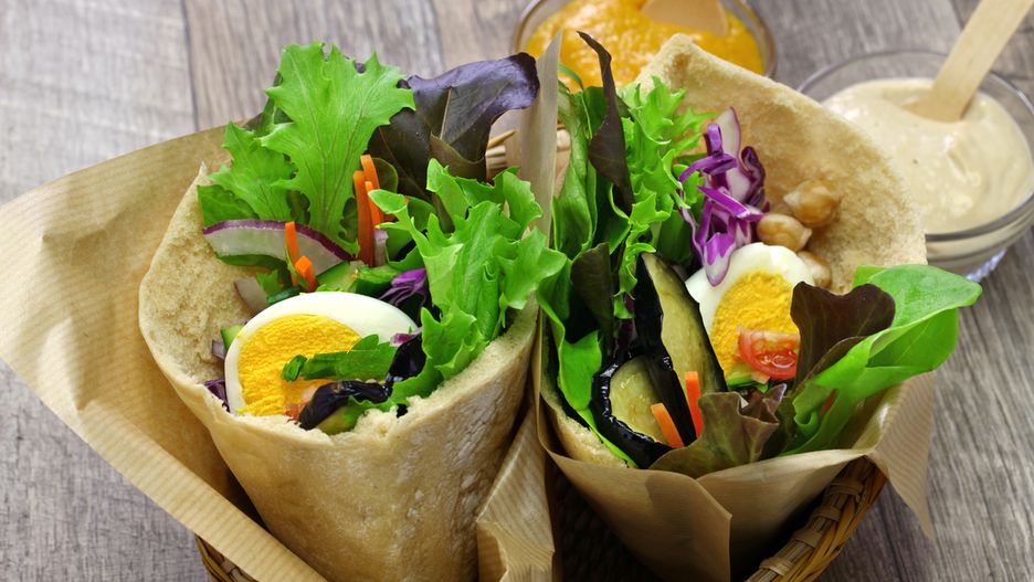 Ostatnią czynnością jest podgrzanie na suchej patelni chlebków pita, przekrojenie ich i wypełnienie dodatkami. Na początku smarujemy pieczywo hummusem, układamy bakłażana, dodajemy sos tahini, jajko oraz sałatkę pomidorowo-ogórkową. Wierzch skrapiamy pastą zhoug.
