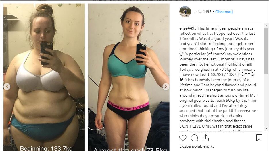 To wystarczyło. Po 10 miesiącach Elise była lżejsza o 50 kg i postanowiła zapisać się na siłownię. Rozpoczęła regularne treningi i udało jej się schudnąć jeszcze 9 kg. Metamorfozę Elise możecie śledzić na jej Instagramie.