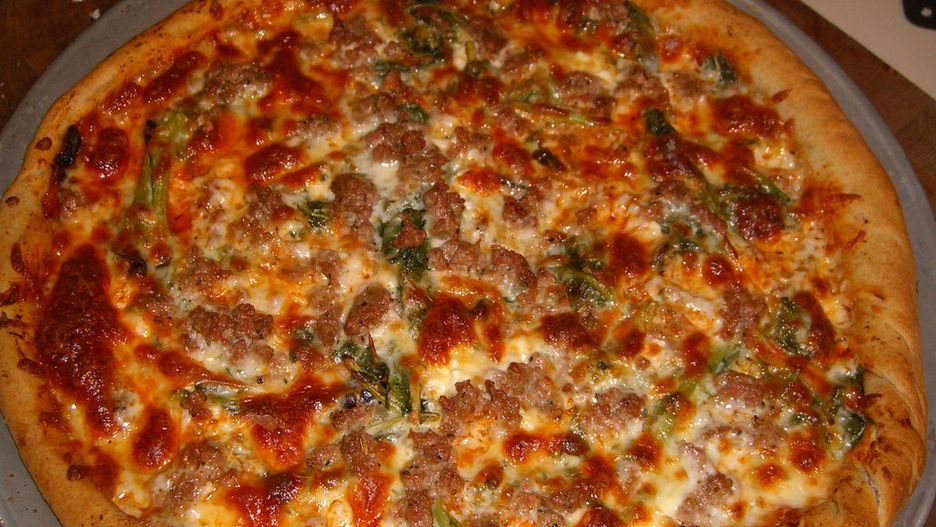 Średnia pizza z kiełbasą na grubym cieście (Pizza Hut) – ile ma kalorii i składników odżywczych?