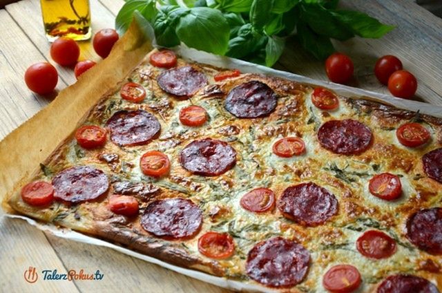 Tarta z chorizo, pomidorkami i rukolą
