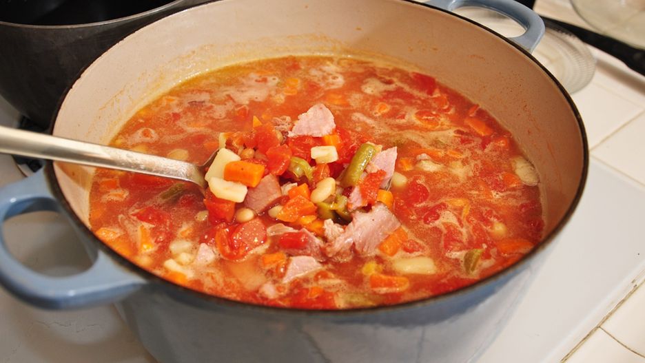 Zupa fasolowa z szynką o obniżonej zawartości sodu przygotowana z dodatkiem wody lub do kupienia gotowa do spożycia